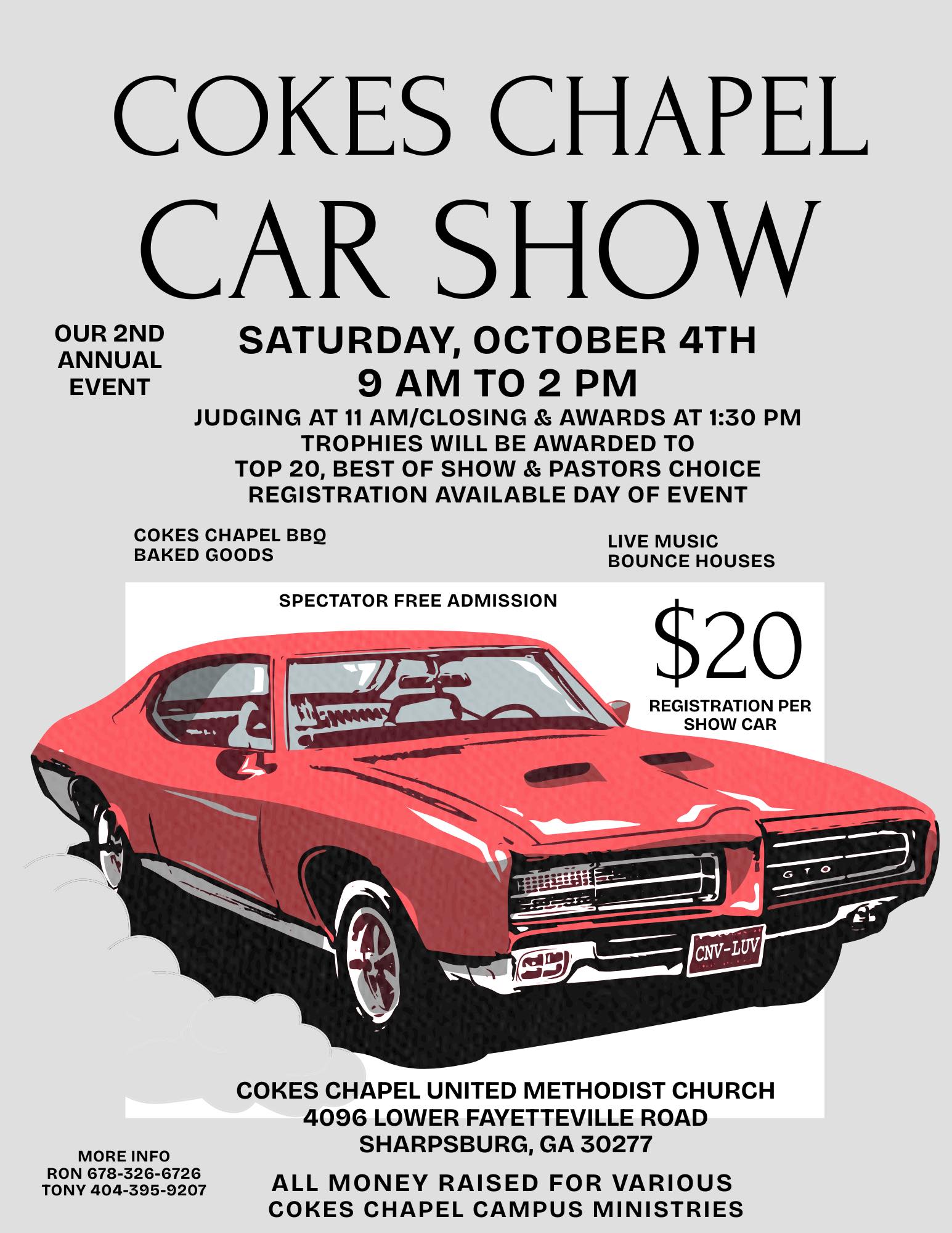 October 4, 2025 @ 9:00 am - 2:00 pm 2025 Car Show Worship Center 4096 Lower Fayetteville Rd, Sharpsburg